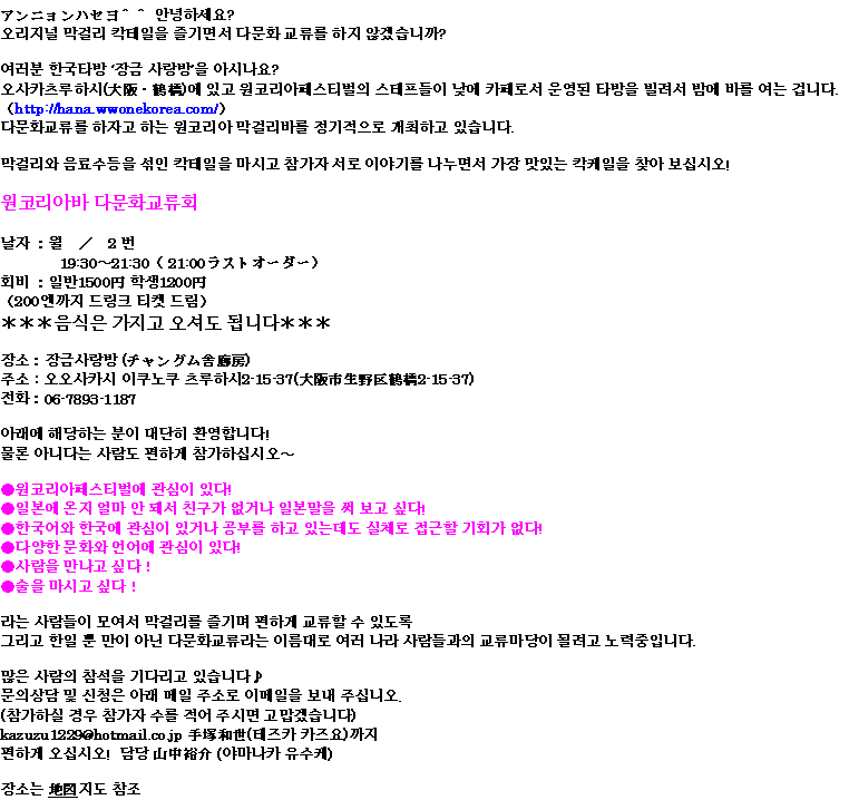 大阪・鶴橋にあり、ワンコリアフェスティバル(http://hana.wwonekorea.com/)のスタッフが通常は昼間にカフェとして営業しているのですが、夜の時間を利用し、定期的に多文化交流を目的とするバーとしてオープンしております!!
